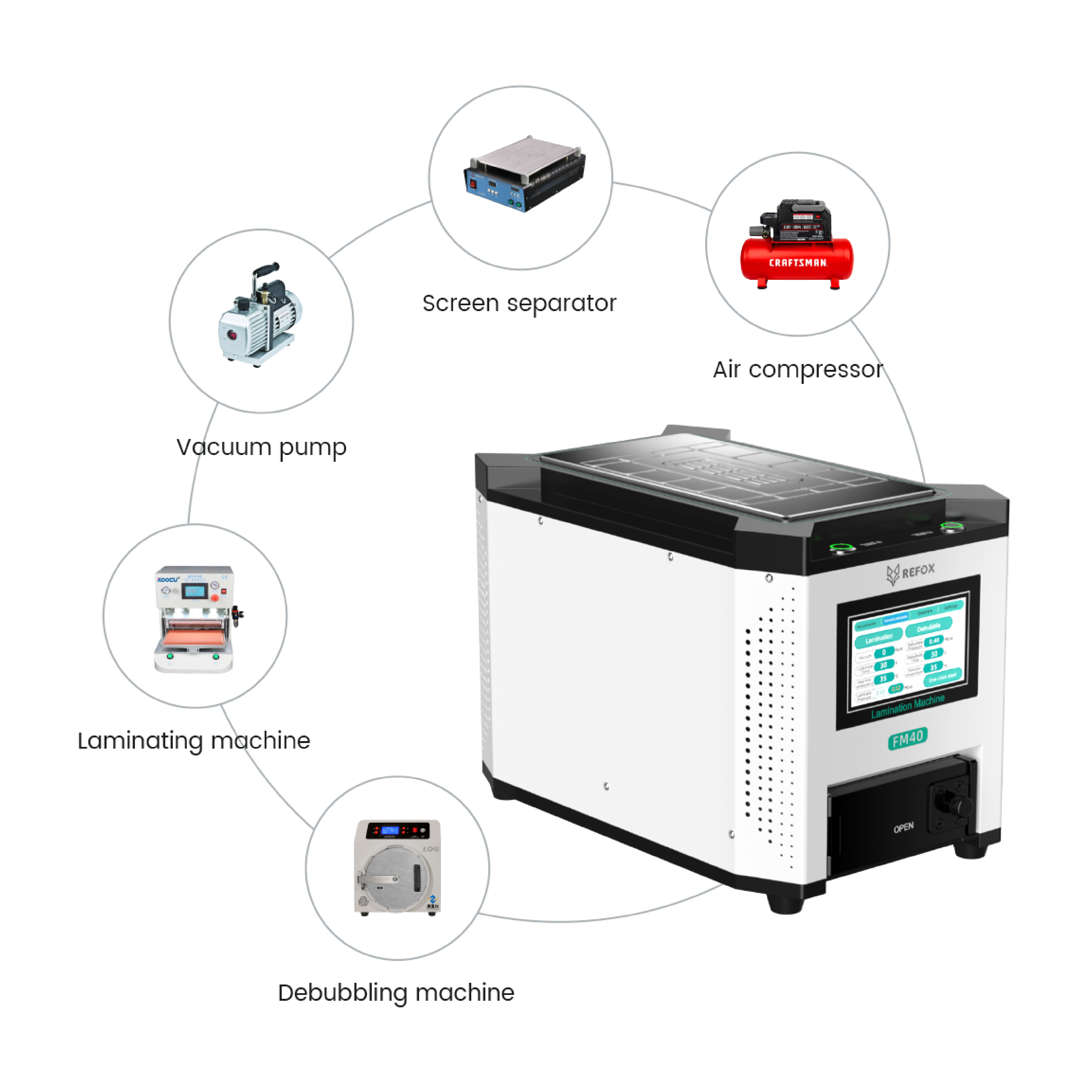 La REFOX FM-40 est une machine de laminage multifonction qui simplifie l'ensemble du processus de rénovation des écrans mobiles. Conçue pour les réparateurs professionnels, elle combine cinq fonctions essentielles en une seule machine :